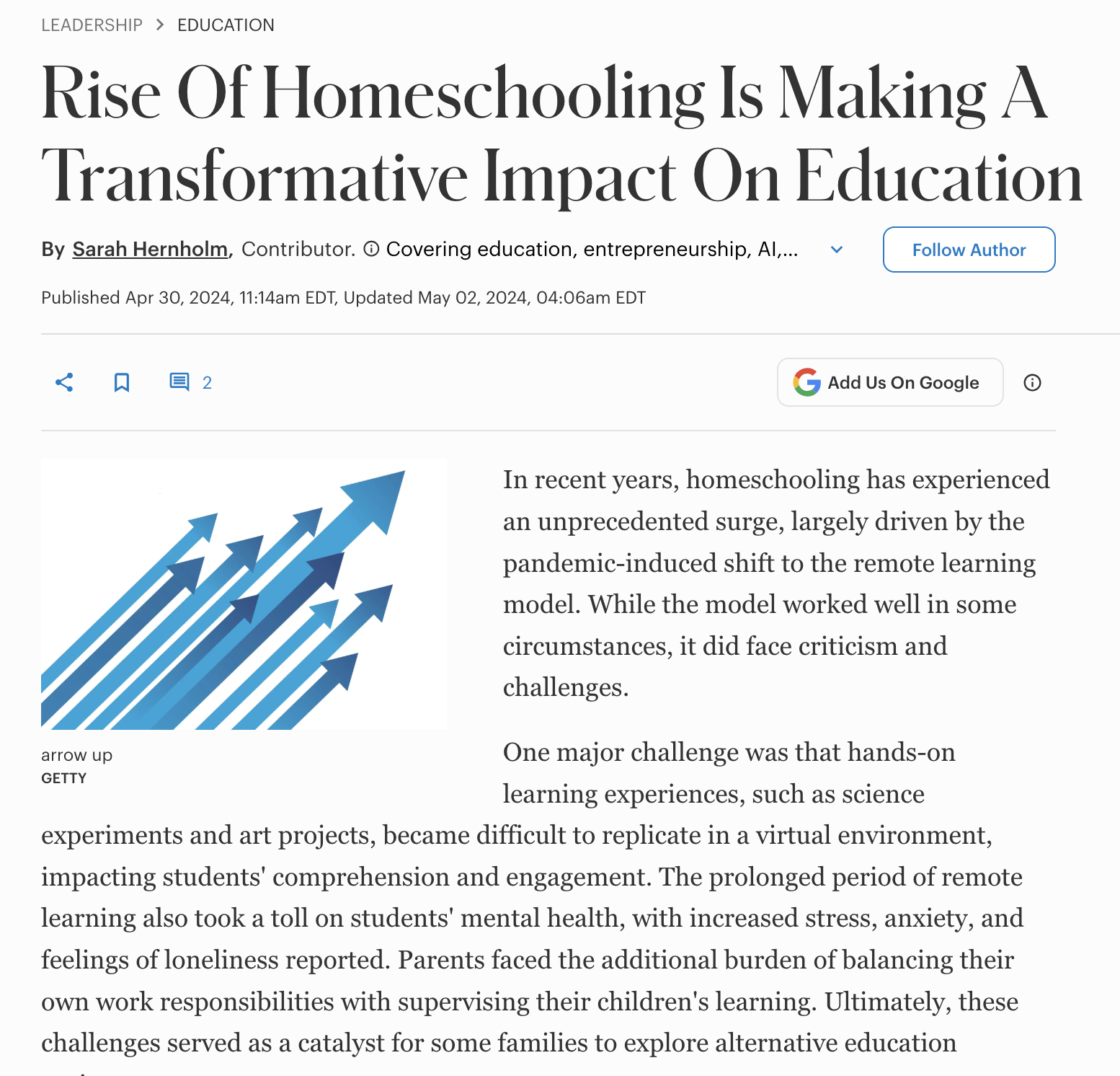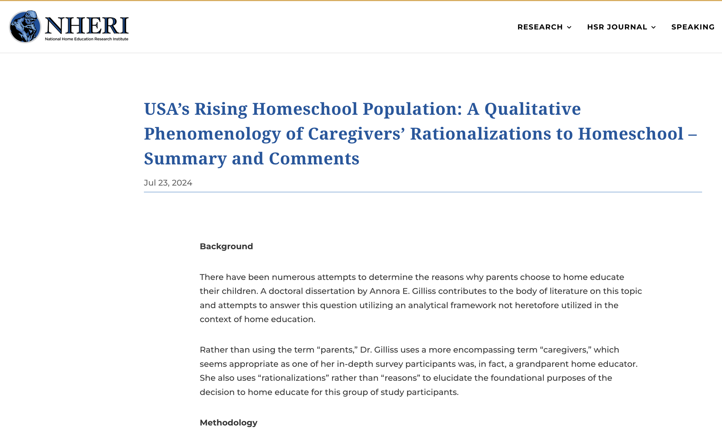 Homeschooling Resources Growth of homeschooling USA Today article favorable to homeschooling Featured Resources USA’s Rising Homeschool Population: A Qualitative Phenomenology of Caregivers’ Rationalizations to Homeschool – Summary and Comments - National Home Education Research Institute NHERI Rise Of Homeschooling Is Making A Transformative Impact On Education - Forbes.com Back to Homeschool Resources