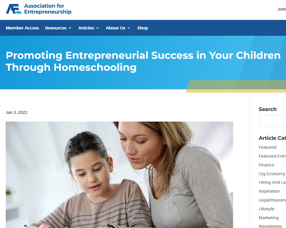 Homeschooling Resources Homeschooling and entrepreneurship Featured Resources Homeschooling Future Entrepreneursheartandsoulhomeschooling.com Three Reasons Why Homeschoolers Become Entrepreneursfee.org Promoting Entrepreneurial Success in Your Children through Homeschoolingafeusa.org