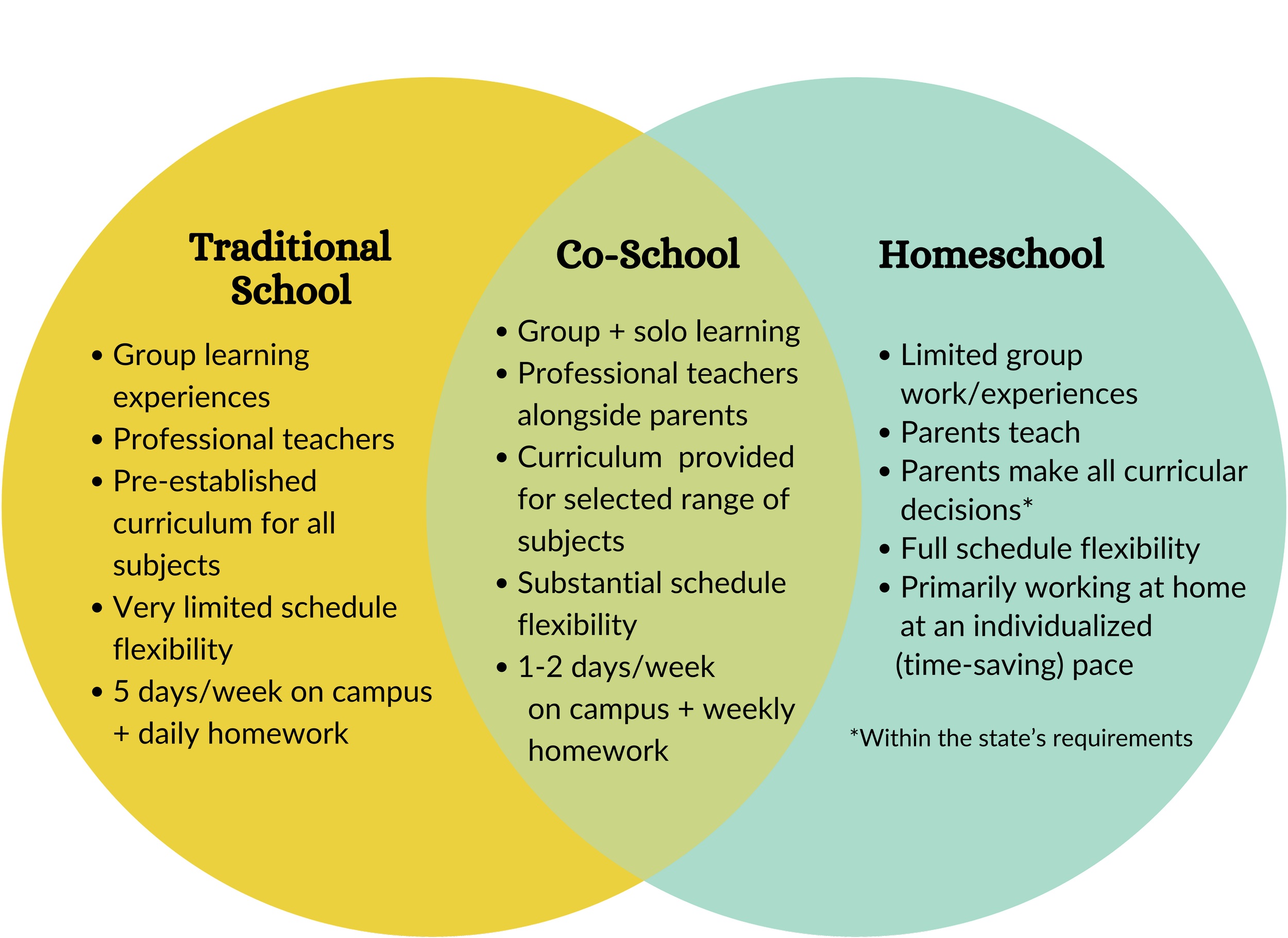 The definition of co-school℠ is an educational institution which partners with homeschooling families to provide group instruction in specific curricula utilizing a professional faculty.